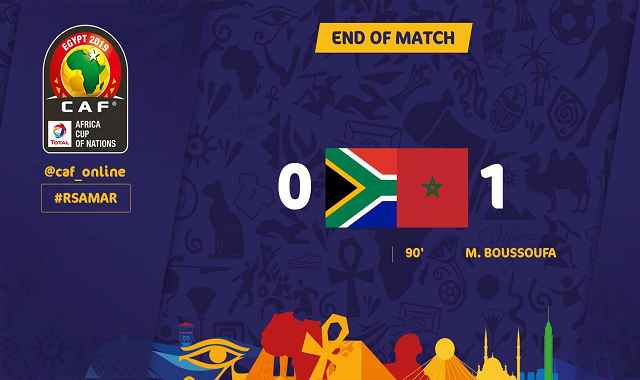 تمكن اليوم المنتخب المغربي من تصدر المجموعة الرابعة بعد الفوز على نظيره الجنوب إفريقي بهدف لصفر، على أرضية ملعب السلام لحساب الجولة الثالثة من دور مجموعات كأس أمم إفريقيا لكرة القدم 2019. وسجل للمنتخب المغربي اللاعب مباراة بوصوفة في الدقيقة 89 من المباراة التي قادها الحكم الكاميروني جون جاك نغامبو ندالا، بمساعدة أوليفي سافاري وسليمان أمالدين، والزامبي الزامبي جاني سيكازوي، حكما رابعا. ودخل المنتخب الوطني المباراة بكل من، منير المحمدي، اشرف حكيمي، غانم سايس، مروان دكوسطا، نصير مزراوي، بوصوفة، كريم الأحمدي، نور الدين امرابط، بلهندة، حكيم زياش، يوسف النصيري. بينما دخل منتخب جنوب افريقيا المباراة بكل من رونو هايدن، ويلسون، مكيز، بونكاني، موتيبا، سايريرو، زوان، موكوتجو، هيلتسيو، هيلتاني، موزي تاو. يشار إلى أن مباراة المنتخب الجزائري والمنتخب التنزاني برسم الجولة الثالثة من دور المجموعات، ستجرى بدورها على أرضية ملعب السلام بعد نهاية مباراة المنتخب المغربي ومنتخب جنوب افريقيا. 1. المغرب 2. المنتخب 3. جنوب إفريقيا 4. فوز 5. كان 2019