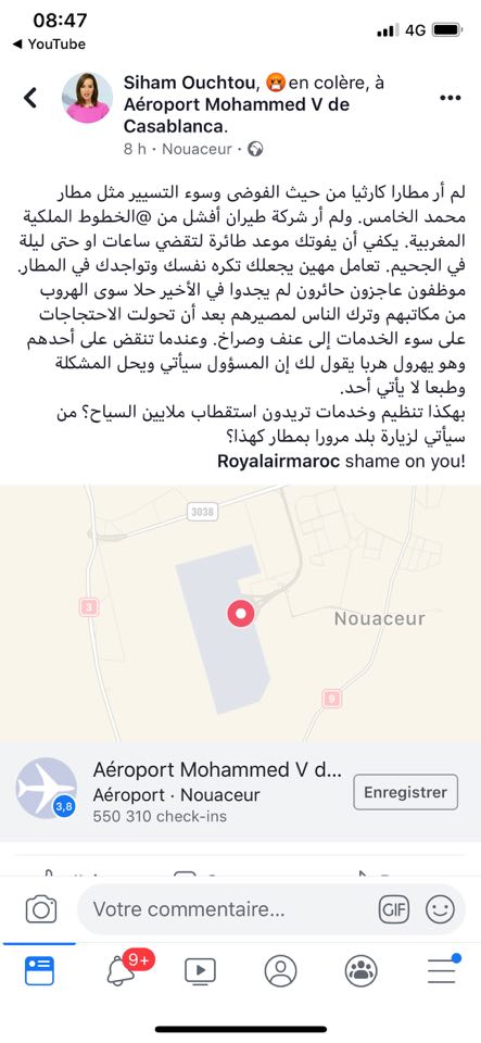 انتقدت الإعلامية المغربية بقناة “دوتشيه فليه” الألمانية سهام أوشطو، الخطوط الملكية الجوية المغربية، مشيرة إلى أنها لم “ترَ شركة أفشل منها” على حد تعبيرها. كما انتقدت أوشطو، في تدوينة على صفحتها بموقع “فيسبوك”، مطار محمد الخامس بالدار البيضاء، بالقول، “لم أر مطارا كارثيا من حيث الفوضى وسوء التسيير مثل مطار محمد الخامس”. مغنية مغربية تفقد حقيبتها في رحلة داخلية: مشاكل لارام لا تنتهي اقرأ أيضا وقالت أوشطو في التدوينة ذاتها، “يكفي أن يفوتك موعد طائرة لتقضي ساعات أو حتى ليلة في الجحيم، تعامل مهين يجعلك تكره نفسك وتواجدك في المطار. موظفون عاجزون حائرون لم يجدوا في الأخير حلا سوى الهروب من مكاتبهم وترك الناس لمصيرهم بعد أن تحولت الاحتجاجات على سوء الخدمات إلى عنف وصراخ، وعندما تنقض على أحدهم وهو يهرول هربا يقول لك إن المسؤول سيأتي ويحل المشكلة وطبعا لا يأتي أحد”. وختمت المتحدثة تدوينتها متساءلة، “بهكذا تنظيم وخدمات تريدون استقطاب ملايين السياح؟ من سيأتي لزيارة بلد مرورا بمطار كهذا؟ “.