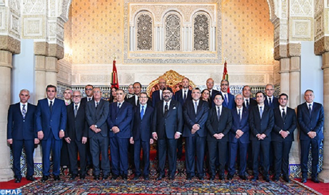 استقبل الملك محمد السادس، اليوم الأربعاء 10 صفر 1441 ه، الموافق 9 أكتوبر 2019م ، بقاعة العرش بالقصر الملكي بالرباط، رئيس الحكومة وأعضاء حكومة الملك في صيغتها الجديدة بعد إعادة هيكلتها. ويتعلق الأمر ب: – السيد سعد الدين العثماني، رئيس الحكومة. – السيد المصطفى الرميد، وزير الدولة المكلف بحقوق الانسان والعلاقات مع البرلمان. – السيد عبد الوافي لفتيت، وزير الداخلية. – السيد ناصر بوريطة، وزير الشؤون الخارجية والتعاون الإفريقي والمغاربة المقيمين بالخارج. – السيد محمد بنعبد القادر، وزير العدل. – السيد أحمد التوفيق، وزير الأوقاف والشؤون الإسلامية. – السيد محمد الحجوي، الأمين العام للحكومة. – السيد محمد بنشعبون، وزير الاقتصاد والمالية وإصلاح الإدارة. – السيد عزيز أخنوش، وزير الفلاحة والصيد البحري والتنمية القروية والمياه والغابات. – السيد سعيد أمزازي، وزير التربية الوطنية والتكوين المهني والتعليم العالي والبحث العلمي. – السيد خالد آيت الطالب، وزير الصحة. – السيد مولاي حفيظ العلمي، وزير الصناعة والتجارة والاقتصاد الأخضر والرقمي. – السيد عبد القادر اعمارة، وزير التجهيز والنقل واللوجستيك والماء. – السيدة نزهة بوشارب، وزيرة إعداد التراب الوطني والتعمير والإسكان وسياسة المدينة. – السيدة نادية فتاح العلوي، وزيرة السياحة والصناعة التقليدية والنقل الجوي والاقتصاد الاجتماعي. – السيد عزيز رباح، وزير الطاقة والمعادن والبيئة. – السيد محمد أمكراز، وزير الشغل والإدماج المهني. – السيد الحسن عبيابة، وزير الثقافة والشباب والرياضة، الناطق الرسمي باسم الحكومة. – السيدة جميلة المصلي، وزيرة التضامن والتنمية الاجتماعية والمساواة والأسرة. -السيد عبد اللطيف لوديي، الوزير المنتدب لدى رئيس الحكومة المكلف بإدارة الدفاع الوطني. – السيد نور الدين بوطيب، الوزير المنتدب لدى وزير الداخلية. – السيد محسن الجزولي، الوزير المنتدب لدى وزير الشؤون الخارجية والتعاون الإفريقي والمغاربة المقيمين بالخارج. – السيدة نزهة الوافي، الوزيرة المنتدبة لدى وزير الشؤون الخارجية والتعاون الإفريقي والمغاربة المقيمين بالخارج، المكلفة بالمغاربة المقيمين بالخارج. – السيد إدريس اعويشة، الوزير المنتدب لدى وزير التربية الوطنية والتكوين المهني والتعليم العالي والبحث العلمي، المكلف بالتعليم العالي والبحث العلمي. وعقب ذلك أدى الوزراء الجدد القسم بين يدي الملك. حضر هذه المراسيم الحاجب الملكي سيدي محمد العلوي. وبهذه المناسبة، أخذت للملك محمد السادس صورة تذكارية مع أعضاء الحكومة. 1. التعديل 2. الحكومة 3. الملك 4. محمد السادس