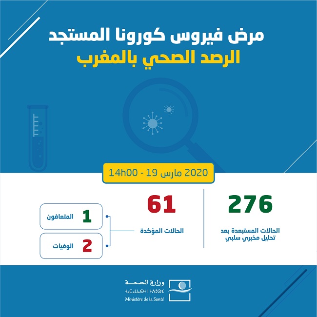 كشفت إحصائيات جديدة نشرتها وزارة الصحة عبر موقعها الرسمي الخاص بمستجدات فيروس “كورونا” المستجد، عن ارتفاع عدد المصابين بالوباء في المغرب إلى 61 حالة، بعد تسجيل 3 إصابات جديدة بالفيروس، زوال اليوم الخميس، بعدما كانت الوزارة قد أعلنت عن تسجيل 4 حالات جديدة صباح اليوم. وأمس الأربعاء، قالت وزارة الصحة، إنها سجلت 5 حالات جديدة مصابة بالفيروس، كلها لمخالطين بجهة فاسمكناس. عاجل .. ارتفاع عدد المصابين بفيروس “كورونا” بالمغرب إلى 58 حالة اقرأ أيضا وذكر بلاغ للصحة، أن هذه الحالات تم تأكيدها مخبريا بمعهد باستور-المغرب والمختبر الوطني للأنفلونزا والفيروسات التنفسية بالمعهد الوطني للصحة بالرباط. وتابع المصدر ذاته، أن هذه الحالات توجد جميعها تحت الرعاية الصحية بالمستشفى حيث سيتم التكفل بها وفقا للإجراءات الصحية المعتمدة. وأمس الأربعاء، قال وزير الصحة خالد آيت الطالب، إن المغرب سجل ظهور بعض حالات الإصابة بفيروس "كورونا" محليا، لكنها معزولة، مشيرا إلى أن هذا المعطى يجب أن يكون مدعاة للحذر، داعيا الجميع إلى الانخراط الجماعي والكلي في التصدي للوباء واتخاذ الاحتياط الشديد. وأوضح الوزير خلال ندوة صحافية بتقنية البث المباشر لتقديم آخر مستجدات الفيروس بالمغرب، أن المغرب سجل إلى غاية مساء أمس الأربعاء، 54 حالة إصابة بفيروسا كورونا، موزعة بشكل مختلف على جميع جهات المملكة، لافتا إلى أن أغلب الحالات هي من الوافدين على البلد. وزارة الصحة تحذر من بؤر محلية ل”كورونا”.. وتدعو المغاربة للاحتياط الشديد اقرأ أيضا وأشار إلى أن المغرب يتوفر على نحو 1640 سريرا للإنعاش، منها 684 سريرا في القطاع العمومي و504 سريرا في القطاع الخصوصي و70 سريرا في الصحة العسكرية و132 سريرا في المؤسسات ذات النفع العام، مع برمجة إحداث مرتقب ل250 سريرا جديدا للإنعاش. ووفق الوزارة، فقد توزعت الحالات بين جهة الرباطالقنيطرة التي سجلت 15 حالة، وجهة بني ملال بحالتين، وجهة الدارالبيضاءسطات ب14 حالة، وجهة كلميم واد نون التي سجلت فيها حالة واحدة. وسجلت جهة فاسمكناس 12 حالة، وجهة مراكشآسفي ب6 حالات، وجهة الشرق التي سجل فيها حالة واحدة، وجهة سوس ماسة ب6 حالات، ثم جهة طنجةتطوان التي سجل فيها 4 حالات. جاري النشر… شكرا على التعليق, سيتم النشر بعد المراجعة خطأ في إرسال التعليق المرجو إعادة المحاولة 1. المغرب 2. كورونا 3. وزارة الصحة