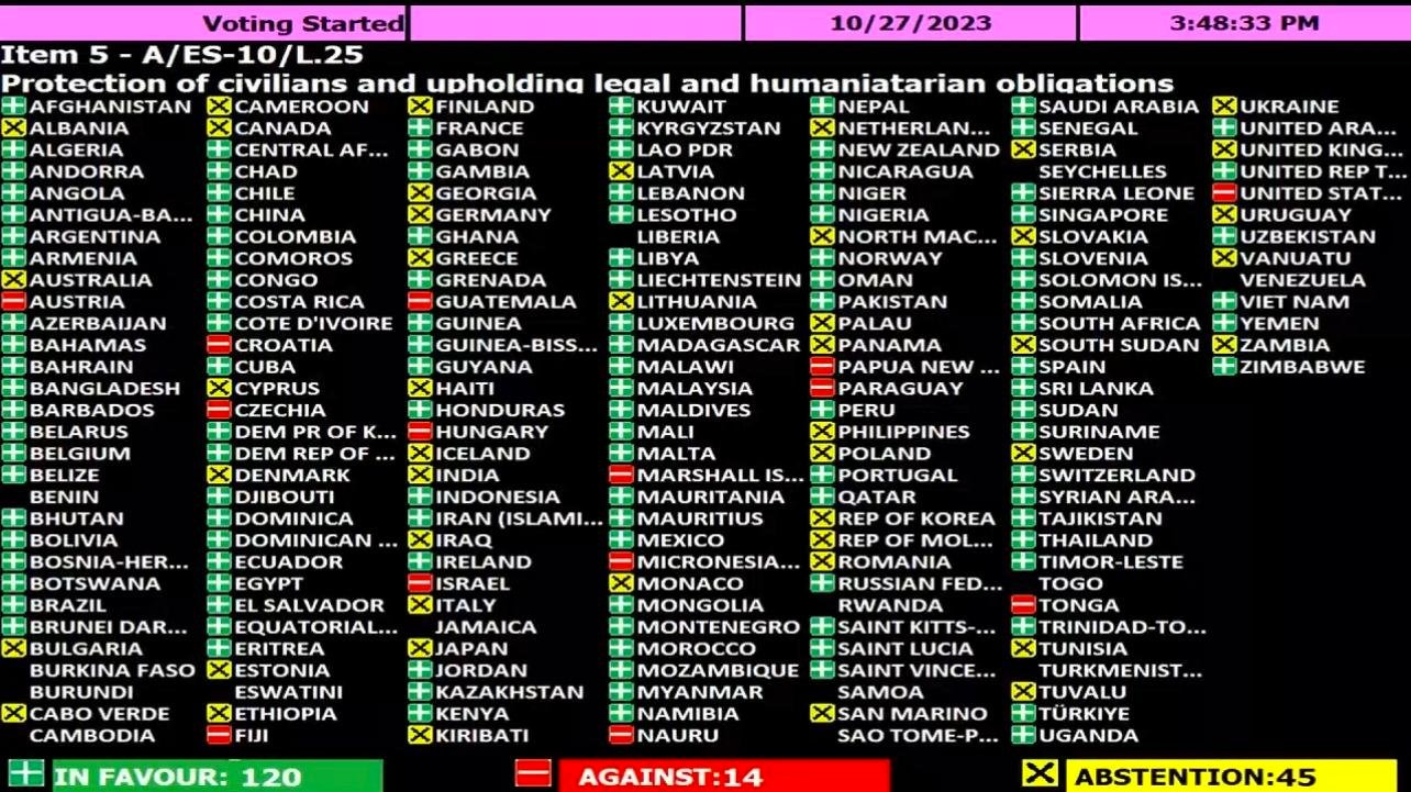 اتهمت إسرائيل 120 دولة، ضمنها المغرب، تبنت في الأممالمتحدة قرارا لإرساء وقف إطلاق نار إنساني في قطاع غزة ب"الدناءة"، معلنة رفضها القاطع لأي دعوة من شأنها وقف إطلاق النار. وقال وزير الخارجية الإسرائيلي إيلي كوهين، عبر منصة إكس، إن إسرائيل ترفض رفضا قاطعا أي دعوة إلى وقف إطلاق النار في غزة. وأضاف مسؤول ديبلوماسية الاحتلال، بأنهم يعتزمون القضاء على حركة المقاومة الإسلامية "حماس" تماما، كما تعامل العالم مع النازيين وتنظيم الدولة الإسلامية، على حد تعبيره. واستنكر كوهين قرار الأممالمتحدة الذي يدعو إلى هدنة إنسانية فورية وثابتة ومستدامة، ووصفه بأنه "مخزي". واعتمدت الجمعية العامة للأمم المتحدة في جلسة طارئة واستثنائية لمناقشة الحرب في غزة، مشروع قرار أعدته المجموعة العربية وتبنته عشرات الدول بعد إدخال تعديلات عليه. وصوتت 120 دولة لصالح القرار و14 دولة ضده، مع امتناع 45 دولة عن التصويت، من بينها ألمانيا. ومن الدول التي تبنت هذا القرار، الأردن وفلسطين والسعودية والإمارات والبحرين وعمان والكويت وقطر ومصر والمغرب والسودان وموريتانيا والصومال والعراق ولبنان وليبيا واليمن وجزر القمر وجيبوتي وروسيا. كما تبنته إندونيسيا وباكستان وبروني دار السلام وبيليز وبنغلاديش وبوتسوانا وبوليفيا وتركيا وكوريا الشمالية وجنوب أفريقيا وزمبابوي وسانت فنسنت وجزر غرينادين والسلفادور والسنغال وفنزويلا وكوبا وماليزيا والمالديف وناميبيا ونيكاراغوا. وطرحت وثيقة القرار التي دعا إليها الأردن للتصويت في جلسة طارئة لمناقشة الحرب الإسرائيلية على قطاع غزة المستمرة منذ 3 أسابيع، بعد عملية طوفان الأقصى التي أطلقتها المقاومة الفلسطينية. ويدعو القرار إلى "هدنة إنسانية فورية ودائمة ومستدامة تفضي إلى وقف للأعمال العدائية" بين إسرائيل وحماس، فضلاً عن "الإطلاق الفوري وغير المشروط" لجميع الرهائن من المدنيين. وتزامن التصويت على القرار مع قطع إسرائيل جميع الاتصالات عن قطاع غزة، وشنّها غارات غير مسبوقة، وصفت بأنها الأعنف منذ بداية الحرب. وأطلق الأمين العام للأمم المتحدة أنطونيو غوتيريش صرخة قال فيها إن النظام الإنساني في غزة "يواجه انهياراً كاملاً مع عواقب لا يمكن تصورها على أكثر من مليوني مدني" من الفلسطينيين. وأكد أنه "نظراً للوضع البائس والمأساوي، لن تتمكن الأممالمتحدة من الاستمرار في تقديم المساعدات داخل غزة من دون حدوث تحول فوري وجوهري في كيفية تقديم المساعدات وكميتها". وقال غوتيريش إنه "يجب السماح للمساعدات الإنسانية المنقذة للحياة – الغذاء والماء والدواء والوقود – بالوصول إلى جميع المدنيين بسرعة وأمان وعلى نطاق واسع». وإذ رحب ب«الإجماع العالمي المتزايد على هدنة إنسانية في الصراع". كما طالب ب"وقف إطلاق النار لأسباب إنسانية، والإفراج غير المشروط عن جميع الرهائن، وتسليم الإمدادات المنقذة للحياة بالحجم المطلوب» لئلا «يواجه شعب غزة سيلاً غير مسبوق من المعاناة الإنسانية". * وكالات