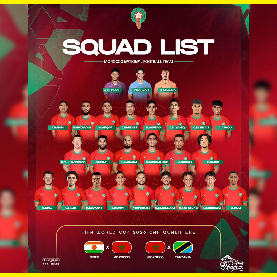 أعلن الناخب الوطني عن قائمة المنتخب المغربي المستدعاة لخوض الجولتين المقبلتين من التصفيات الإفريقية المؤهلة لكأس العالم 2026، حيث سيواجه "أسود الأطلس" منتخبي النيجر وتنزانيا في مباراتين حاسمتين ضمن مشوار التأهل للمونديال.